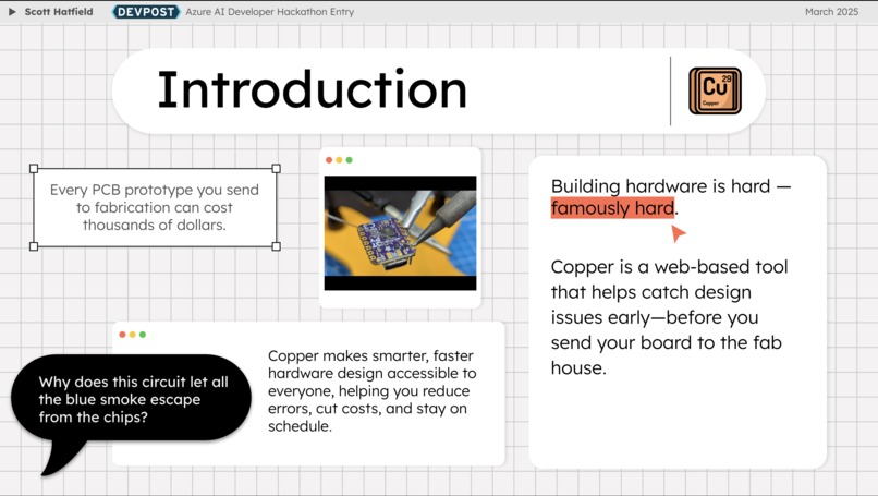 CopperEnhance your PCB designs with AI-powered analysis. Leveraging Azure AI Services, Copper identifies design issues and offers actionable recommendations for engineers to refine their projects.