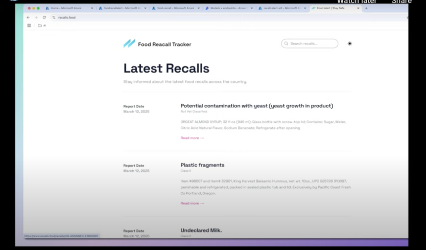 Food Recall Alert SystemThe Recall Alert System is designed to integrates data from openFDA and enhances it with Azure AI services to deliver accurate and relevant recall alerts.